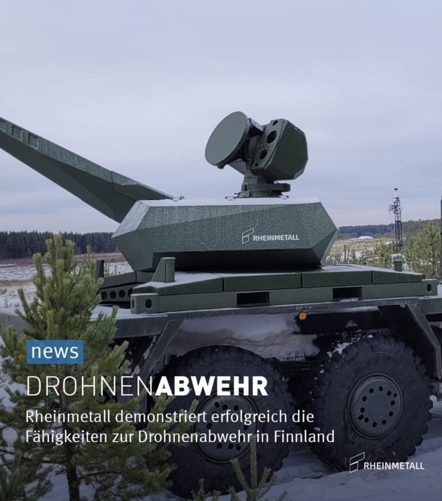 (ud) Rheinmetall in Düsseldorf hat im Rahmen der Ground-Based Air Defence (GBAD) Demo Days auf dem Schießplatz im finnischen Lohtaja erfolgreich seine Fähigkeiten im Bereich der Drohnenabwehr (Counter-small Unmanned Aerial Systems (c-sUAS)) präsentiert. Die Teilnahme von Vertretern der Rheinmetall Air Defence erfolgte auf Einladung des Inspekteurs der Flugabwehr der finnischen Streitkräfte.